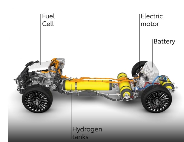 Powered by electricity made in its innovative fuel cell stack that fuses oxygen and hydrogen together. Instead of being powered by electricity stored in a battery, hydrogen fuel cell electric vehicles produce their electricity through a chemical reaction between hydrogen and oxygen in a fuel cell stack..